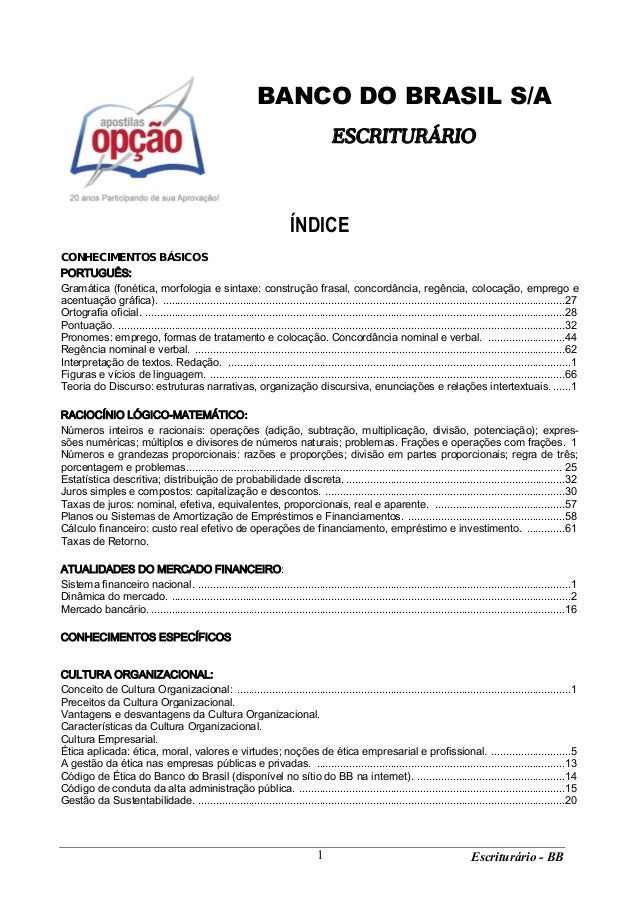 Скачать escriturário banco do brasil apk 25.0 для андроид. O curso de teoria para o banco do brasil é um curso com o conteúdo necessário para a sua aprovação. Um ingresso para a semana aquece banco do brasil, que vai de 22/02 a 26/02, sempre às 18h 30% off no curso banco do brasil Estude com antecedência e conquiste a sua vaga! Apostila específica do concurso público para escriturário do banco do brasil 2008.